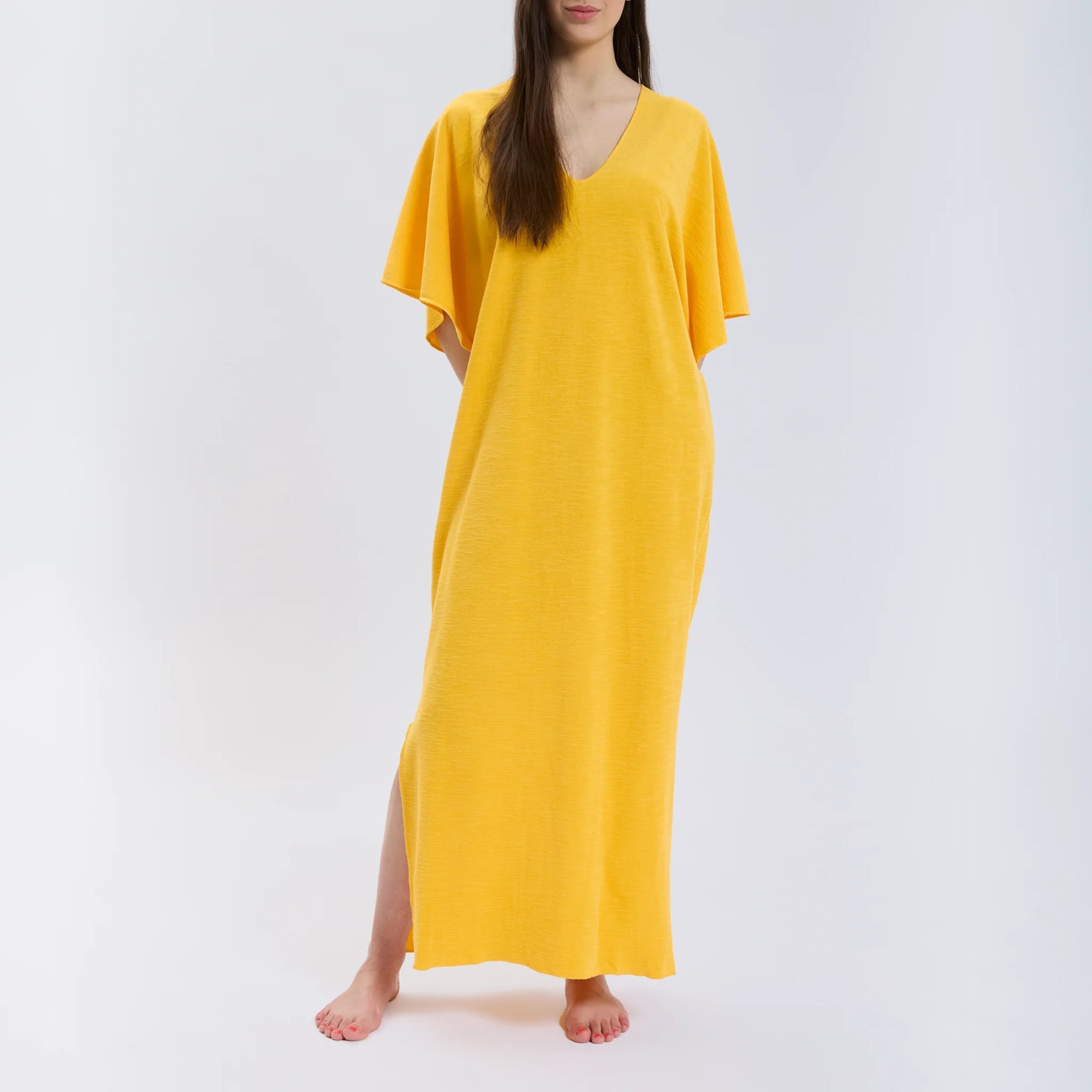 De V-hals kaftans hebben halflange mouwen en een hoge zijsplit. Of je nu naar het strand gaat, geniet van een zomerse dag met vrienden in de tuin, net de douche uitkomt, of gewoon lekker comfortabel thuis bent, de kaftans zijn geschikt voor iedere gelegenheid.